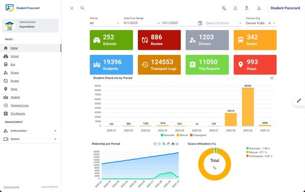 StudentPassCard provides districts with peace of mind and the necessary tools to manage transportation safely and efficiently. With secure QR passes acting as digital IDs for students, drivers have access to a straightforward app that displays who is riding. Additionally, administrators can monitor real-time metrics with live location data, all while ensuring each student is identified with their student identification card.